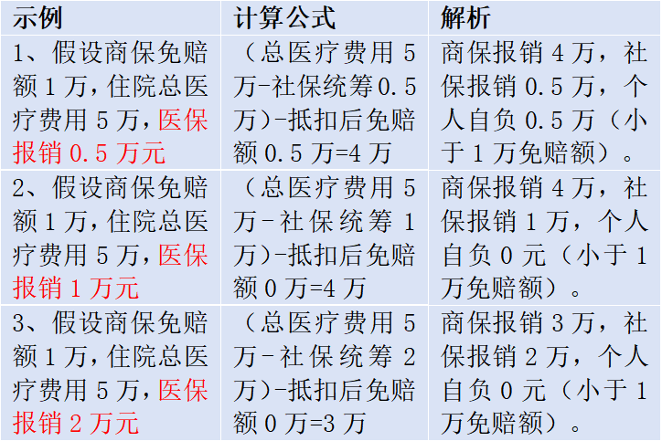1、只要社保统筹报销和其他途径已报销金额超过保单免赔额,则对于剩余未报销医疗费用无需扣减免赔额,按约定比例进行计算给付保险金。